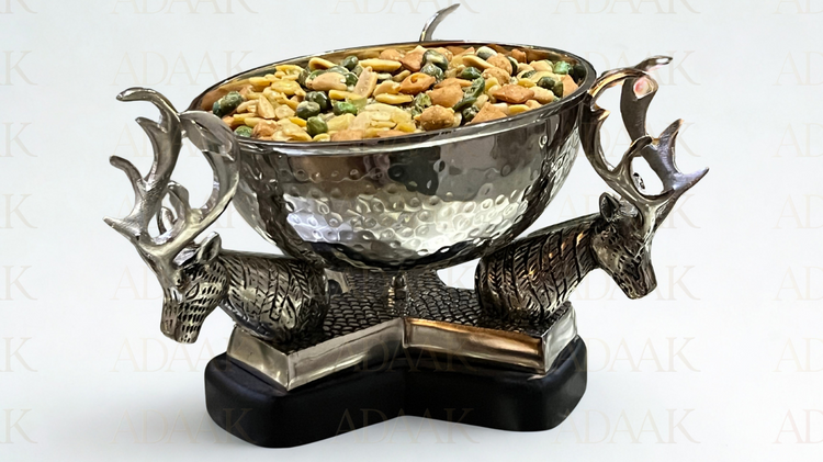 Introducing the commanding ADAAK Mystic Deer Bowl, a masterpiece of decorative metal serveware. The stunning bowl features a richly hammered finish that catches the light beautifully, highlighting its artisan quality. This exquisite vessel is uniquely supported by two intricately sculpted deer figures resting on a polished dark base, lending a sophisticated, rustic luxury aesthetic to your space. Use this Luxury Metal Bowl Gift to display gourmet treats, act as a dazzling table centerpiece bowl, or present it as an unforgettable award or keepsake. It's the ideal piece for those who appreciate nature-inspired design coupled with the high craftsmanship synonymous with the ADAAK brand.