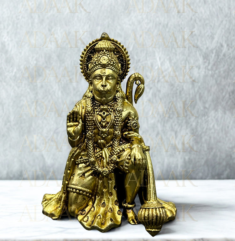 The Adaak Devotional Lord Hanuman Idol is a revered and profoundly reassuring piece, expertly crafted from pure brass, that beautifully embodies strength tempered by humility and service. This majestic figure portrays Lord Hanuman kneeling in a posture of deep devotion, with his powerful mace (Gada) resting next to him. His right hand is raised in the universally recognized Abhaya Mudra (the gesture of blessing and reassurance), signifying protection and the removal of fear. The entire brass sculpture is defined by rich, intricate detailing, evident in the elaborate crown, multiple layers of necklaces, finely crafted dhoti, and the distinct heavy form of the Gada.