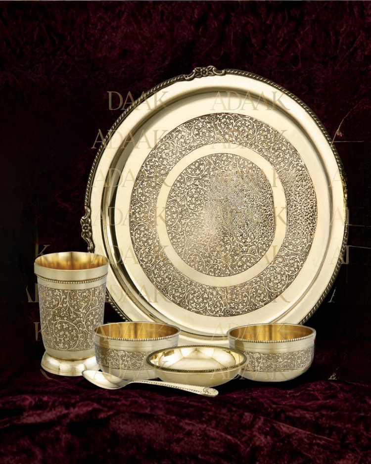 - Set Includes: 1 engraved thali, 1 glass, 1 spoon, 2 bowls, 1 chutney bowl