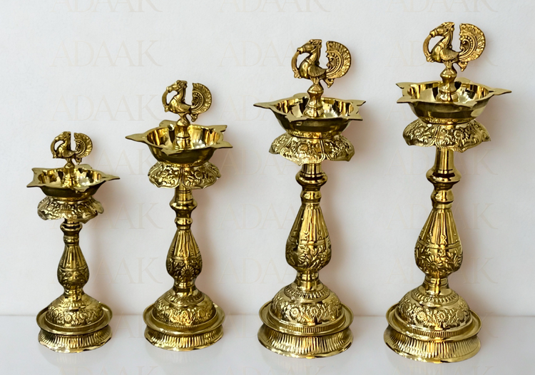 Command reverence and illuminate important events with the ADAAK Grand Brass Peacock Diya Stand. Crafted from high-quality, polished brass, this tall and ornate lamp stand is an essential piece of Traditional Indian Lampware. The design is rich with intricate carvings on the base and column, symbolizing prosperity and divinity. Crowning the Deepam (lamp) reservoir is a magnificent peacock finial, a cherished symbol of grace and auspiciousness. Traditionally known as a Kuthu Vilakku or Deepam stand, this lamp is perfect for lighting at inaugurations, housewarming ceremonies, or as permanent temple style brass lamp decor in your home. It serves as a striking, symbolic focal point that brings light and positive energy to any setting.