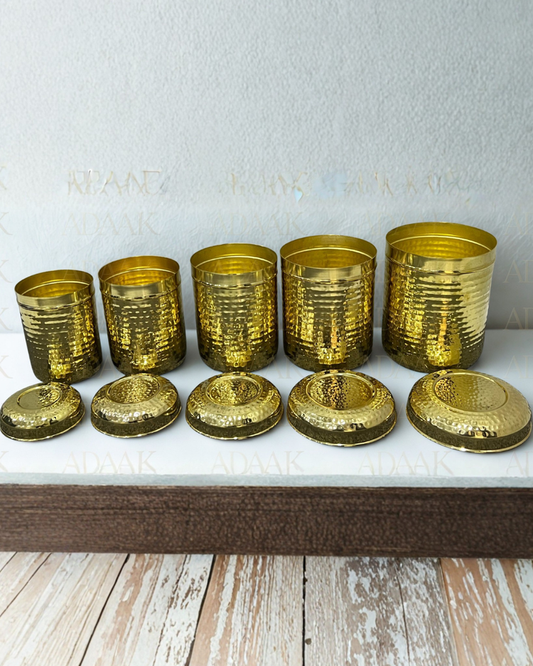 The Adaak Hammered Khazana Storage Set includes five stackable, handcrafted containers in graduated sizes. Each box features a lustrous golden finish with a hand-hammered texture and snug-fitting lids, blending timeless Indian artistry with functionality. Ideal for storing dry foods, spices, snacks, or household essentials, this set brings a sense of luxury and warmth to your kitchen, pantry, or gifting occasions.