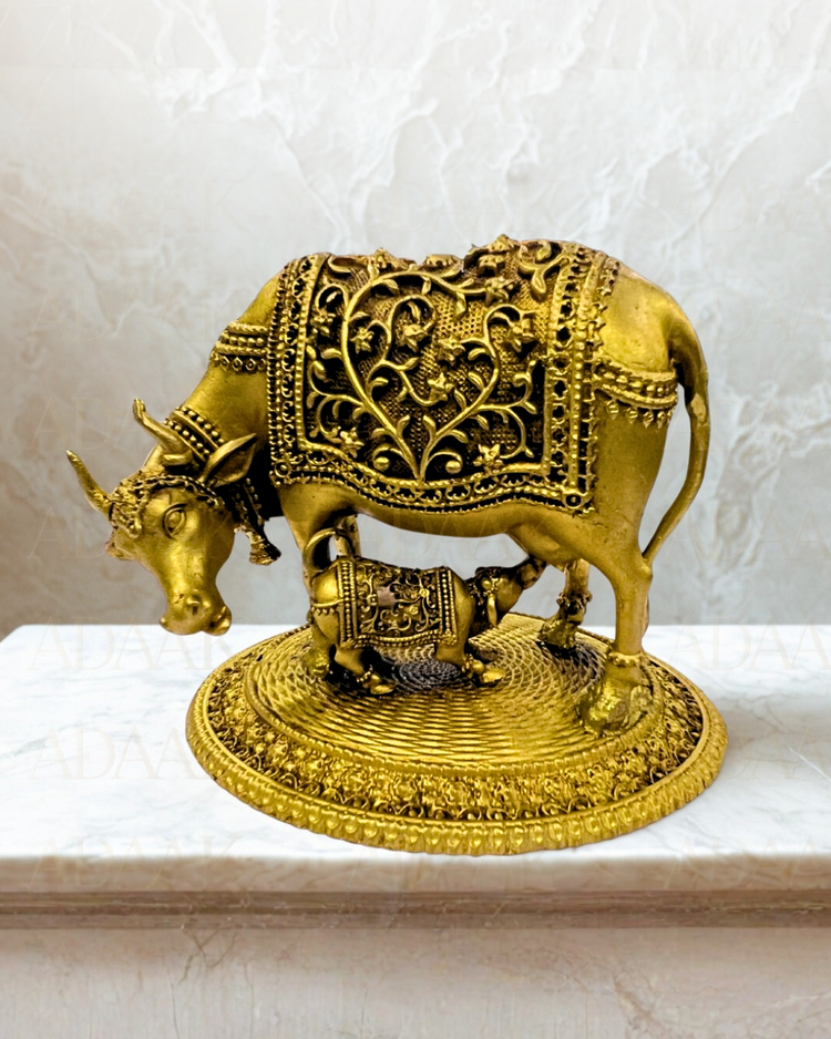 Elevate your home's spiritual and aesthetic appeal with the Handcrafted Brass Kamdhenu Cow with Calf Statue. This Kamadhenu Murti represents the celestial, wish-fulfilling cow. The depiction with the calf, Nandini, emphasizes the divine bond of motherhood, purity, and fertility. Crafted from durable, pure brass, the statue exudes a rich golden glow that symbolizes spiritual abundance and longevity. As a powerful Vastu Cow Figurine, its presence is highly recommended to eliminate negative energies, attract financial success, and foster harmony among family members. This Holy Cow with Calf figurine is more than a decor item; it is a source of peace, prosperity, and spiritual growth.