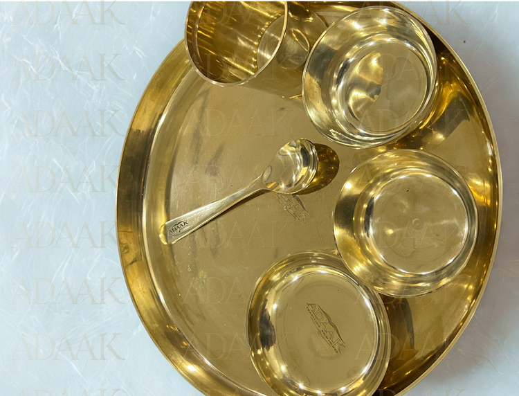 Adaak honors the legacy of traditional Indian serveware by providing high-quality, authentic items like our Kansa Dinner Thali Set. We ensure each piece, from the large Thali to the matching Katori bowls, Spoon, and Glass, is crafted from genuine Kansa (Bronze) alloy. This commitment not only ensures superior durability and a rich golden finish but also maintains the Ayurvedic integrity associated with Kansa serveware. Invest in this exquisite set to elevate your dining experience and introduce a touch of traditional wellness and luxury to your home.