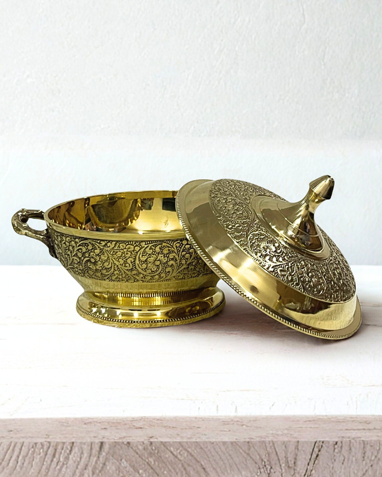 Elevate your dining experience with this brass donga and lid. It features stunning, floral etching across the exterior. Handcrafted by skilled artisans, this lidded serving bowl is perfect for festive gatherings and special occasions. A true piece of luxury Indian metal art for your table.